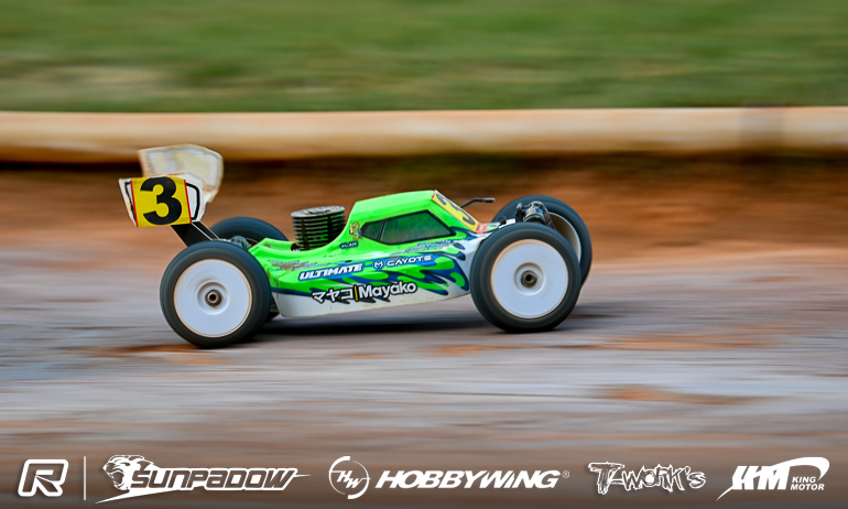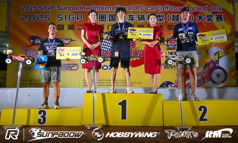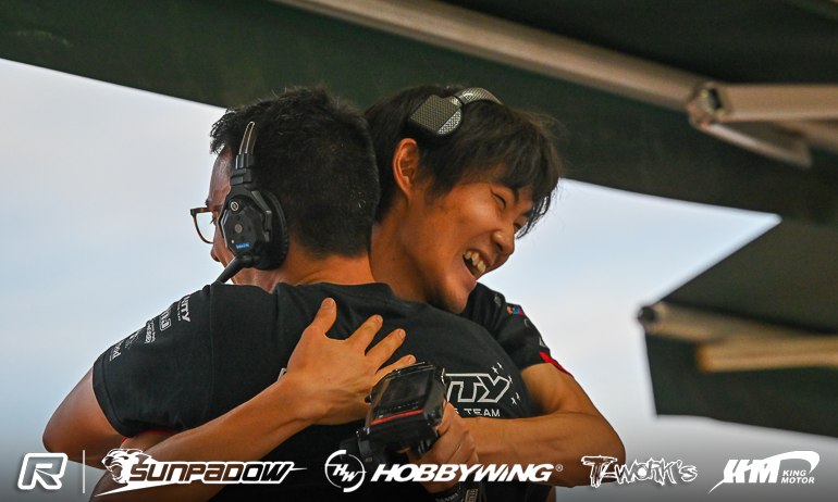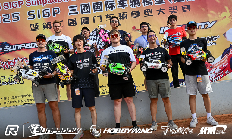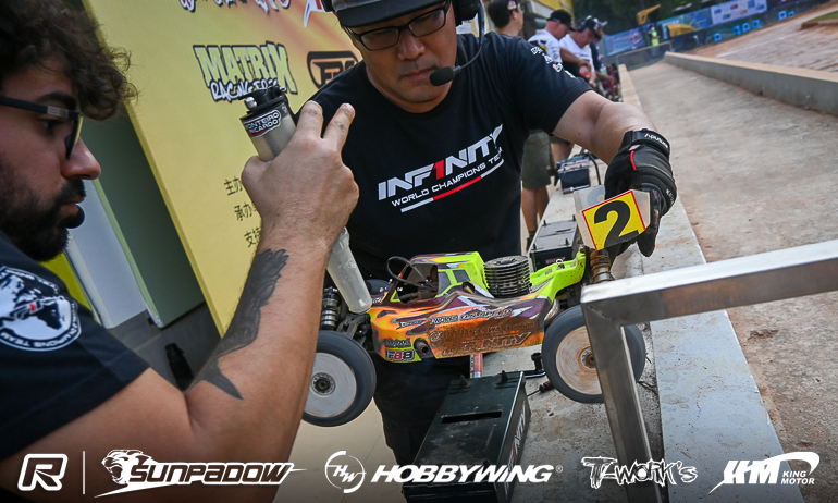Infinity’s Kouki Kato has just taken one of the most exciting wins of his career, the Japanese driver winning the Sunpadow International Grand Prix after a thrilling last lap duel with Top Qualifier & majority race leader David Ronnefalk following 45-minutes of racing around the very challenging 3 Circles track in Xiamen. With Chinese host track of the 2017 1:10 Offroad World Championships famed for its challenging bumpy conditions, it looked like Ronnefalk had taken control of the race with the main battle being for second place between Kato and his team-mate Bruno Coelho. However a track that even the world’s best respect as being one of the most challenge there is, it didn’t take much for Ronnefalk’s lead to be eroded. Passed by Kato on lap 56 of 80, the 19-year-old with hold the former World Champion at bay for 9-laps until a mistake with 7-minutes remaining, the local crowd invested in the racing and providing exciting audio as the leading drivers fell foul of track conditions. Back in front and with the clock ticking down, Ronnefalk would again get tripped up by the track on the penultimate lap. Coming of the main straight side by side to start the final lap, just as the computer signalled the finish of the 45-minutes, the pair took the jump on to the back straight and touched in the air both buggies tumbling but Kato having the better luck landing on his wheels. While Ronnefalk tried to get back in touch over the remainder of the 34-seconds lap it wasn’t to happen and Kato took the win, the crowd appreciative of the thrilling finish. Behind, by over 8-seconds, it was once again Coelho, winner of the eBuggy finals, who completed the nitro podium while Pekko Iivonen and Jung Hyunkyu were best of the rest in fourth & fifth.
