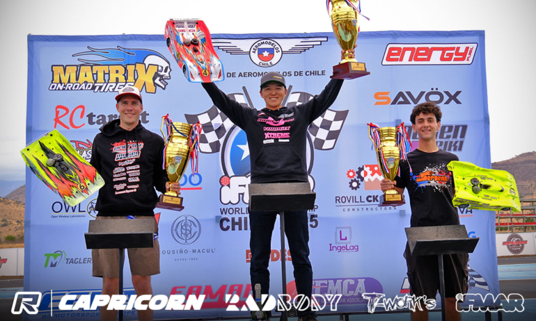 It’s a very elusive club and up to now it has been exclusive to Italians, but today in Chile Mugen Seiki’s Shoki Takahata became a multiple 1:8 Onroad World Champion with a perfectly executed 1-hour main. Starting from fourth on the grid, once the 2019 World Champion worked his way to the front he would take control of the race eventually winning by over a lap from Simon Kurzbuch to give the new MRX7 a 1-2 finish. Takahata’s win would be made all the easier after issues for Top Qualifier Andrea Catanzani, who needed to make a body change in the race, and star of this week’s action Maxime Ripoll, the French teenager robbed of a second place finish as reward for his impressive efforts when his engine came to halt with 6-minutes remaining. While Kurzbuch benefited from this, with a fast charging Catanzani recovering ground, there would be a late & intense battle for the runner-up spot that also involved Capricorn’s Toni Gruber, the trio all running together on track. As the race approached the final minute, Catanzani having just got passed Gruber would then attempt a pass on Kurzbuch but contact was made resulting in his Serpent having a spin as the other two continued. The super fast Italian, who was the only driver to run a 17-second lap in the Main, would however get back up to Gruber and snatch the final podium position on the last corner of the last lap.