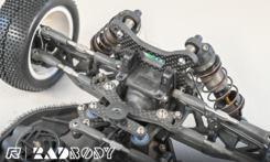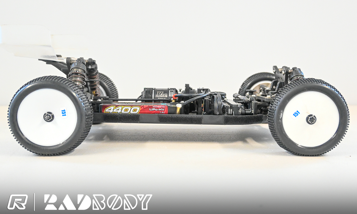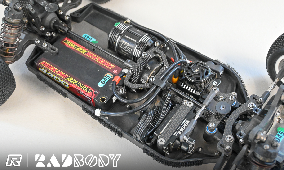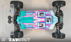 Broc’s World Championship winning buggy features a new, soon to be released optional, flat mounting servo chassis brace as well as a more adjustable rear pivot.  His car is also fitted with Whitz Racing Products ceramic bearings, titanium turnbuckles, and a titanium screw set.